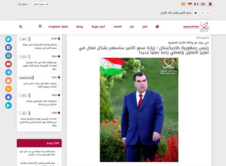 Хабарнигорони Агентии миллии иттилоотии Қатар аз Сарвари давлат муҳтарам Эмомалӣ Раҳмон бо суолҳо оид ба натиҷаҳои сафари давлатии Амири Давлати Қатар, рушди муносибатҳо байни Давлати Қатар ва Ҷумҳурии Тоҷикистон, ҳолати кунунӣ ва ояндаи ҳамкориҳои дуҷониба, инчунин соҳаҳои калидии ҳамкориҳо, муроҷиат карда посухҳои амиқ гирифтанд.